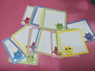 I found this cute printable owl notes on https://tipjunkie.com/ rainbow-owl-notes/ and printed them, cut and made Irene write on them to be attached to the paperbag.